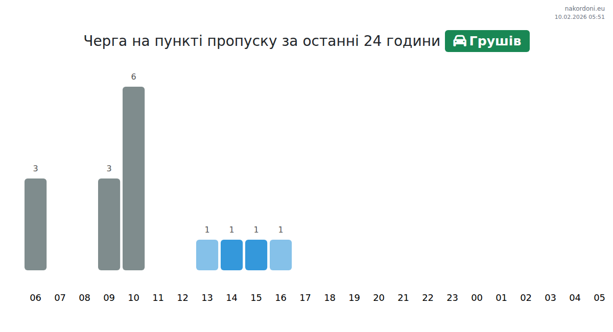 На контролно-пропускателния пункт Грушив очаквайте време за изчакване от 15-57 минути. Избягвайте пиковите часове: 14:00, 11:00, 10:00. Най-доброто време за преминаване е 00:00, 05:00, 06:00.