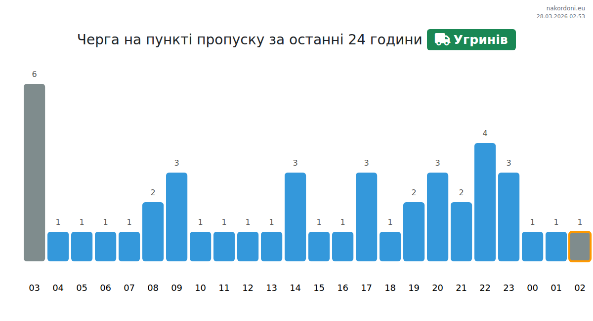 At Uhryniv until end of tomorrow, expected queue is 15–22335 minutes for vehicles. Peak hours: 17:00, 15:00, 18:00. Shortest queues expected at 02:00, 03:00, 04:00. Tonight and tomorrow morning traffic will be moderate.