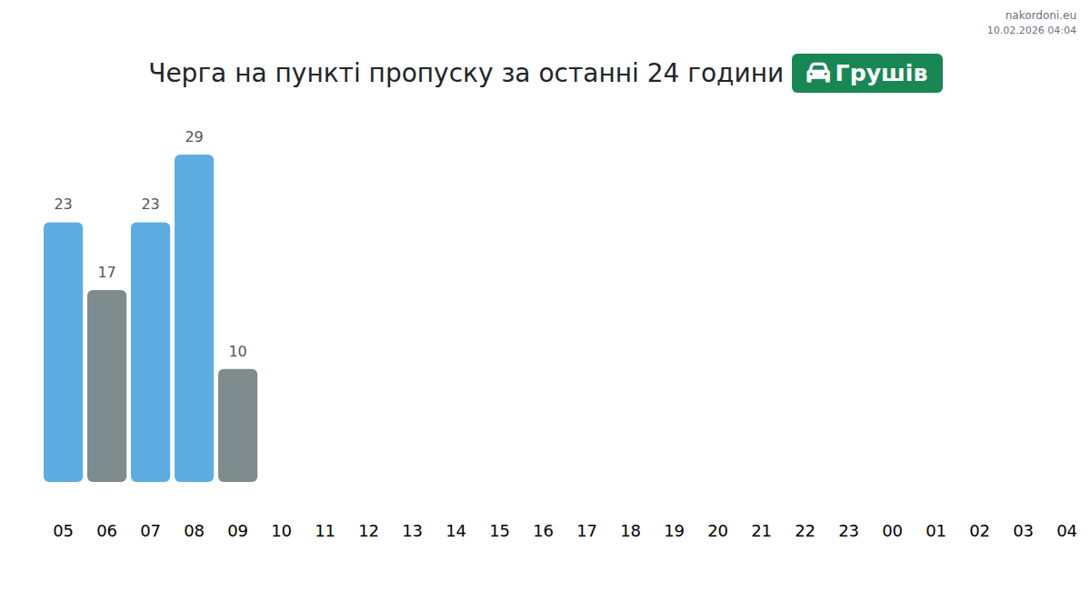 На пункт Грушив, времето за изчакване за леки автомобили варира от 15 до 3535 минути. Избягвайте пиковите часове около 05:00, 03:00 и 01:00. За по-кратки опашки преминете в 00:00, 02:00 или 06:00.