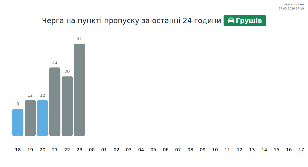 At Hrushiv until end of tomorrow, expected queue is 15–3535 minutes for passenger cars. Peak hours: 05:00, 03:00, 01:00. Shortest queues expected at 23:00, 00:00, 02:00. Tonight and tomorrow morning traffic will be moderate.