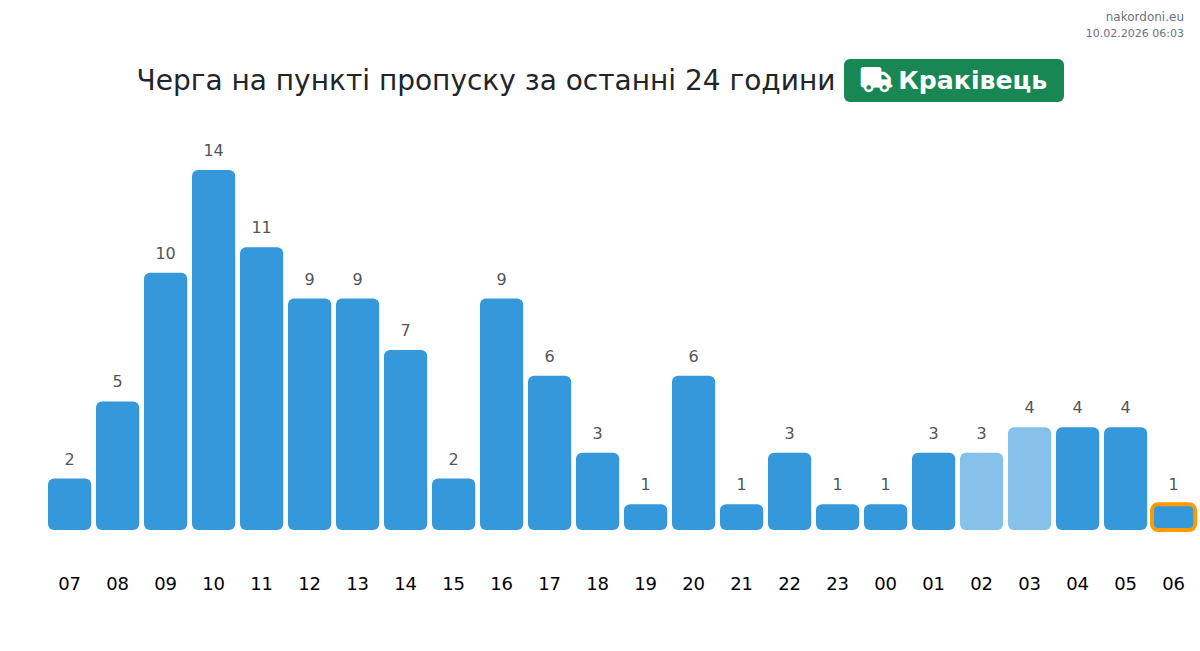 На граничния пункт Кракивець времето за изчакване е между 15-6015 минути. Избягвайте пиковите часове: 08:00, 00:00 и 01:00. Най-добрите часове за преминаване са 02:00, 03:00 и 04:00.