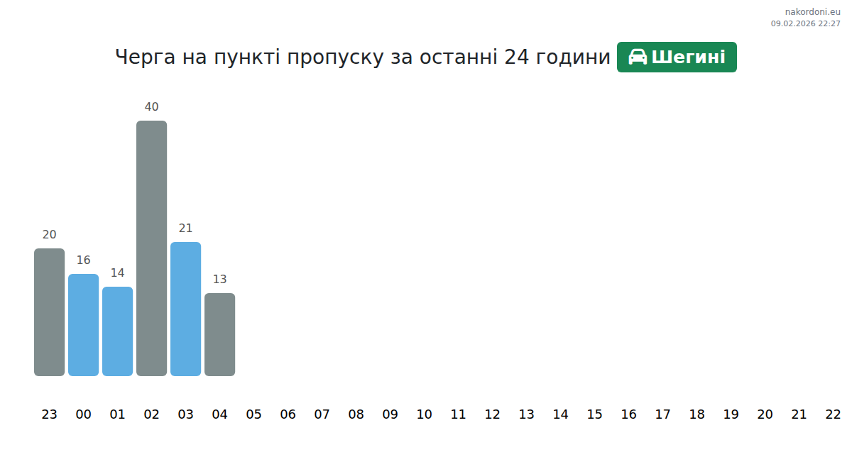На Шегини, очаквайте време за изчакване за леки автомобили между 15-3615 минути. Избягвайте пиковите часове в 14:00, 08:00, 00:00. Най-кратките опашки обикновено са около 23:00, 01:00 и 04:00.