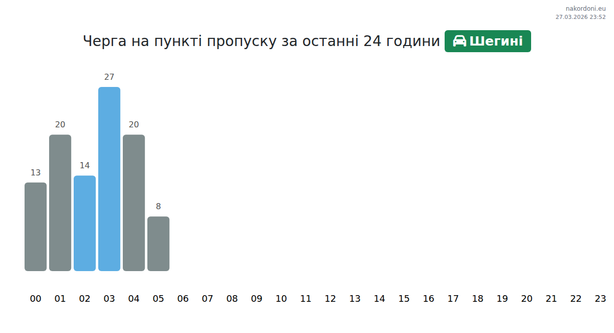 Today at Shehyni the expected queue for passenger cars is 15–3615 minutes. Peak hours: 19:00, 14:00, 00:00. Best crossing times: 01:00, 04:00, 05:00. Average wait throughout the day is around 1121 minutes. Forecast accounts for daily patterns and current conditions.