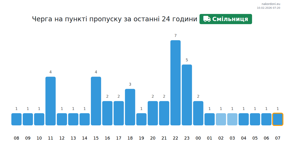 На ГКПП Смильниця очакваното време за изчакване за камиони е 15-135 минути. За да избегнете дълги опашки, избягвайте пиковите часове: 20:00, 21:00, 22:00. Най-кратки опашки се очакват около 02:00, 03:00 и 00:00 часа.