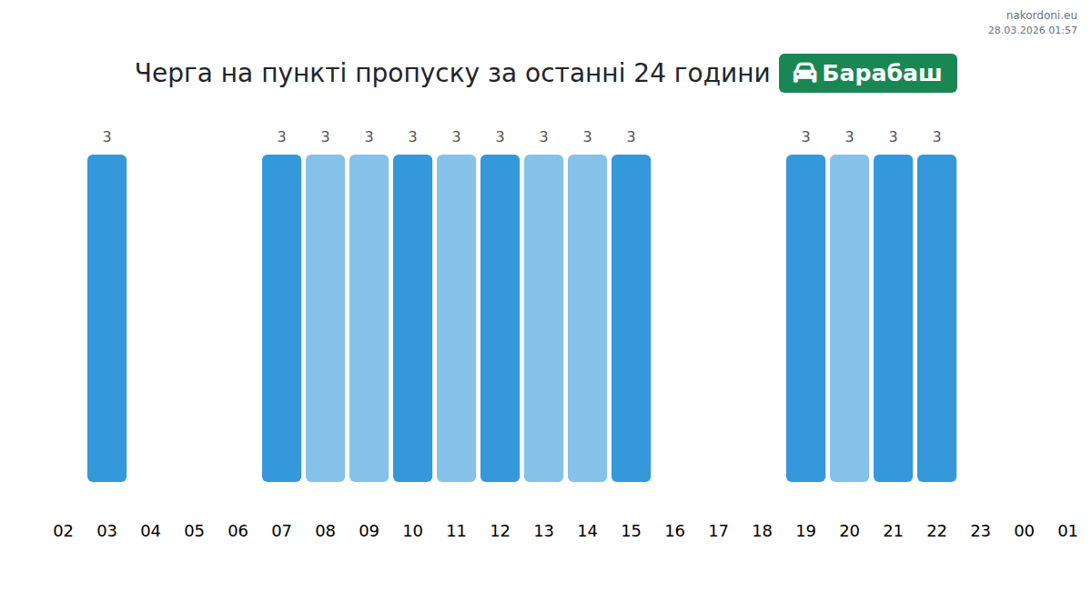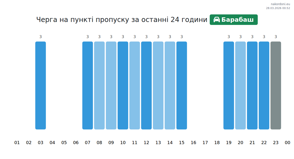 At Barabash until end of tomorrow, expected queue is 15–285 minutes for passenger cars. Peak hours: 13:00, 16:00, 12:00. Shortest queues expected at 20:00, 21:00, 22:00. Tonight and tomorrow morning traffic will be moderate.
