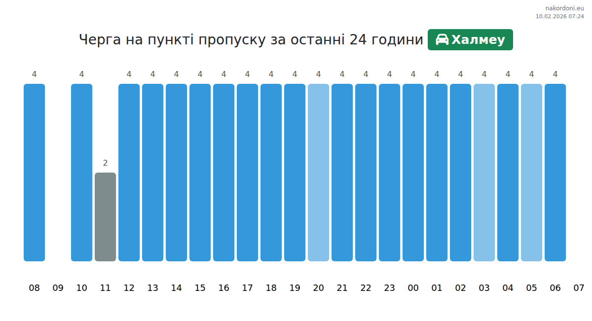 На граничния пункт Халмеу се очакват времена за изчакване между 15 и 495 минути. За по-бързо преминаване избягвайте пиковите часове 22:00, 09:00 и 17:00. Най-кратките опашки се прогнозират между 23:00 и 01:00 часа.