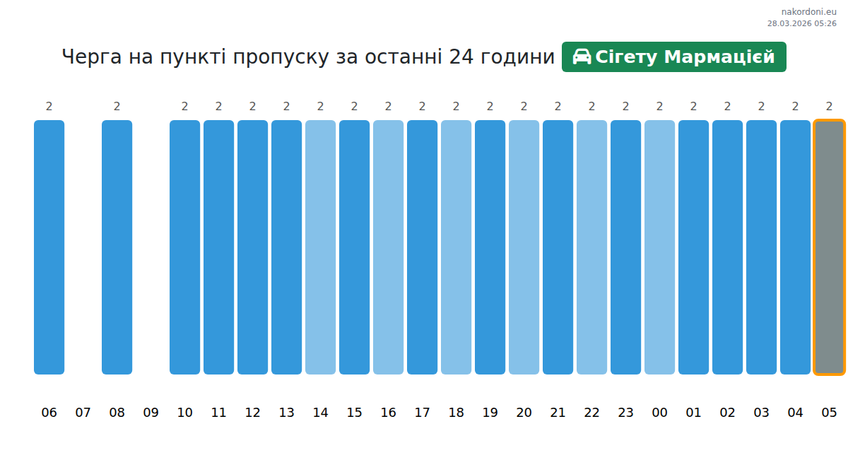 Today at Sighetu Marmatiei the expected queue for passenger cars is 15–165 minutes. Peak hours: 21:00, 22:00, 09:00. Best crossing times: 23:00, 00:00, 01:00. Average wait throughout the day is around 21 minutes. Forecast accounts for daily patterns and current conditions.