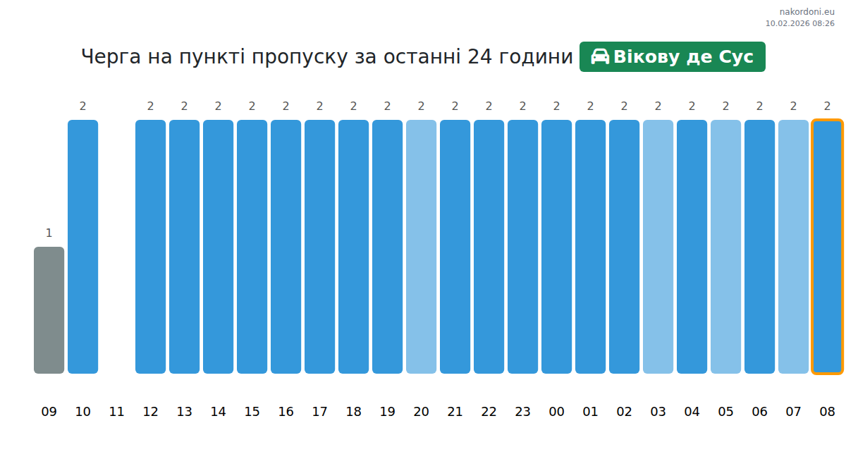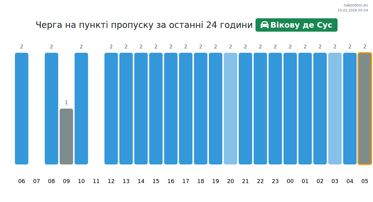 На пункт „Викову де Сус“ времето за изчакване за леки автомобили е 15-27 минути, средно 16 минути. За да избегнете закъснения, избягвайте пиковите часове: 22:00, 07:00, 02:00. Най-кратки опашки се очакват между 23:00 и 01:00 часа.