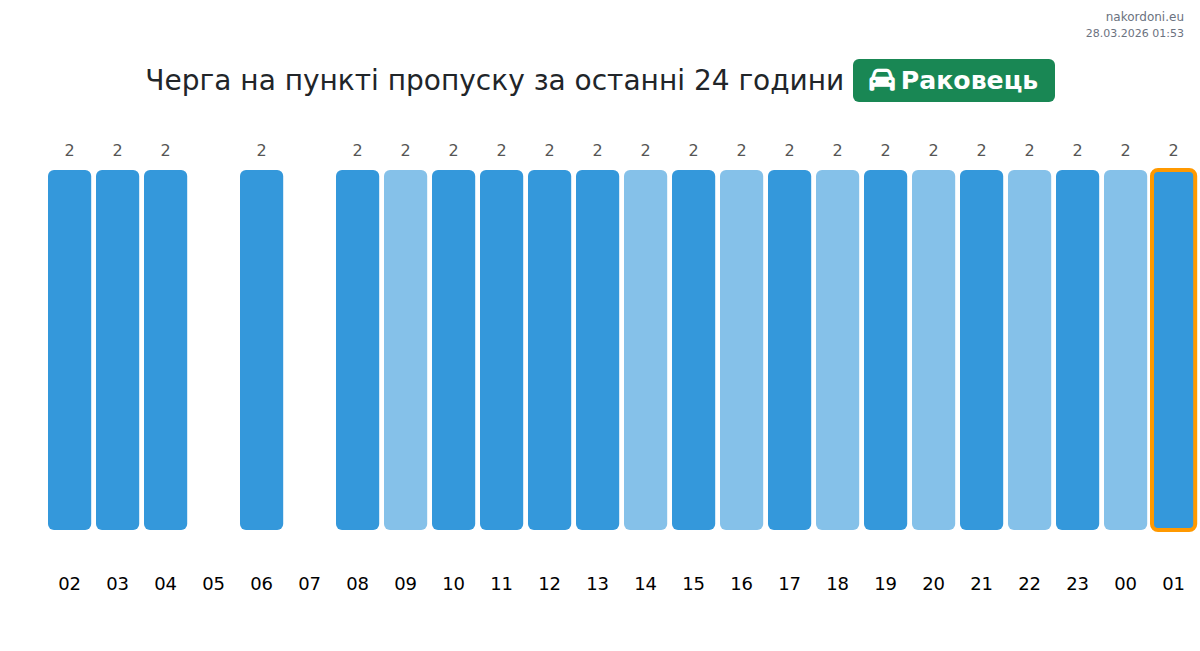 At Rakovets until end of tomorrow, expected queue is 15–21 minutes for passenger cars. Peak hours: 18:00, 19:00, 13:00. Shortest queues expected at 20:00, 21:00, 22:00. Tonight and tomorrow morning traffic will be moderate.