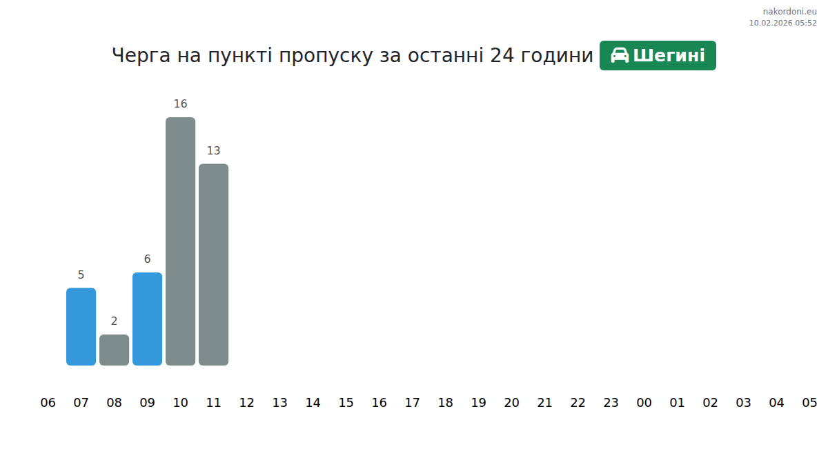 На граничния пункт Шегини очаквайте време за изчакване за леки автомобили от 15 до 189 минути. Избягвайте пиковите часове: 18:00, 17:00 и 13:00. Най-доброто време за преминаване е 01:00, 02:00 и 05:00 за по-кратки опашки.