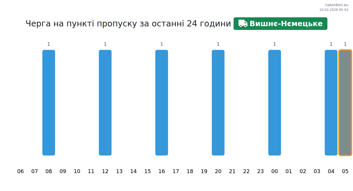 За периода 09.02.2026 от 00:00 до 23:59 на границата на КПП Вишне-Немецьке - товарен транспорт бяха записани следните ключови моменти: