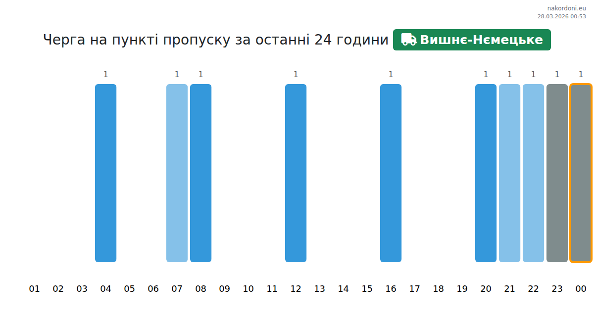 За да избегнете дълги опашки на границата на КПП Вишне-Немецьке - товарен транспорт, препоръчваме да планирате преминаването на границата в часовете с най-малко натоварване. Според данните от изминалия ден, най-малкият брой превозни средства е наблюдаван между :00 и 4:00 часа. Това е идеалното време за преминаване на границата, за да спестите време и да избегнете закъснения.