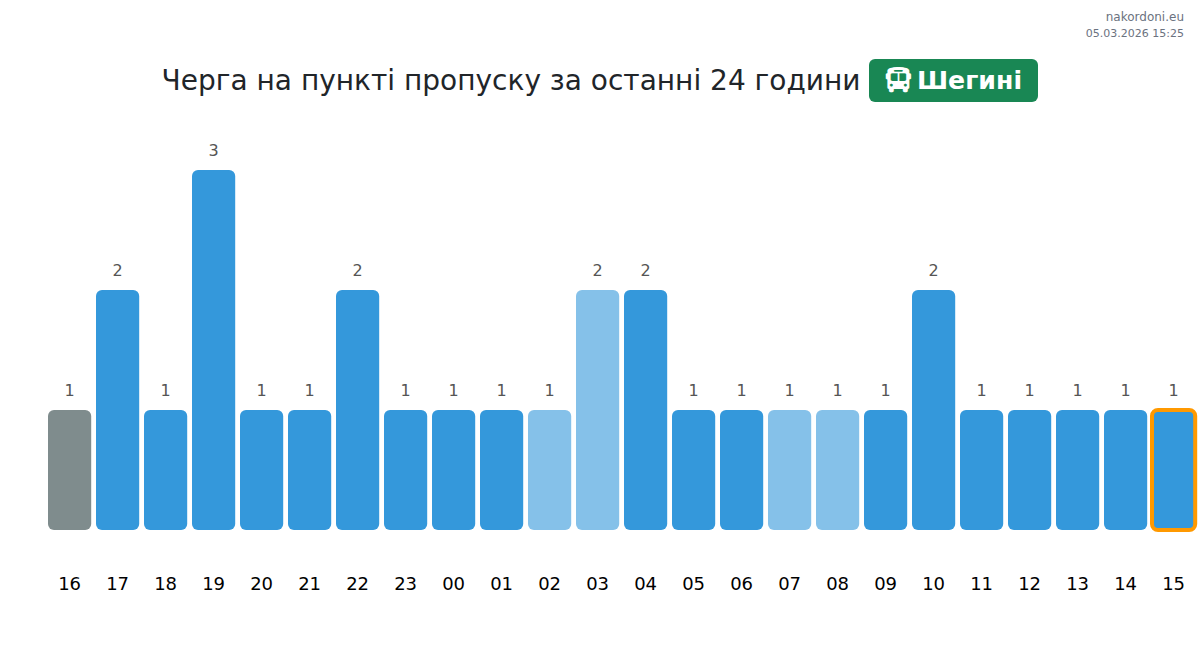 На Шегини времето за изчакване на автобуси е 15-255 минути. Избягвайте пиковите часове между 20:00 и 22:00 ч. Най-добрите часове за преминаване са 05:00, 09:00 и 23:00 ч.