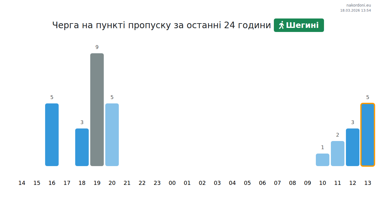 В Шегини се прогнозира време за изчакване на превозни средства между 15-78 минути. Избягвайте пиковите часове: 08:00, 06:00 и 10:00. Най-кратките опашки се очакват между 22:00 и 00:00.