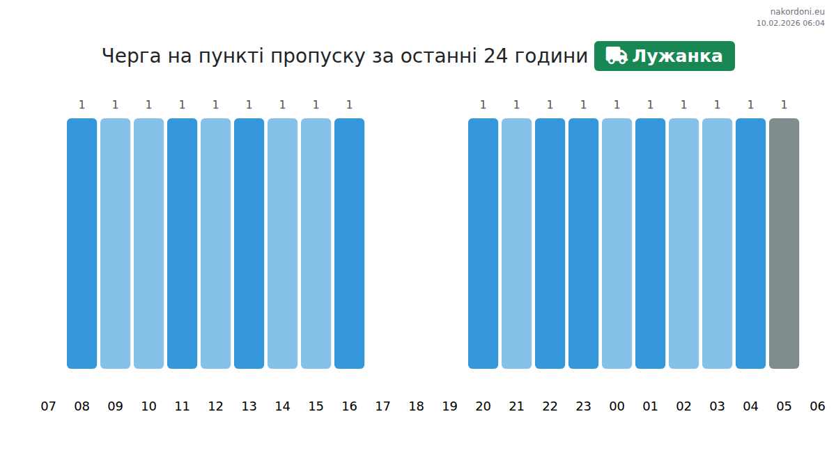 Броят на превозните средства през Нощни часове (00:00 - 06:00). Най-ниската точка беше наблюдавана в 01:00 09.02.2026 — 1 камион. Най-високата точка беше регистрирана в 01:00 09.02.2026 — 1 камион.