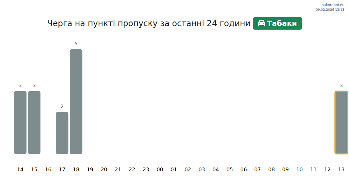 На граничния пункт Табаки очаквайте време за изчакване за леки автомобили 15-45 минути. За да избегнете дълги опашки, избягвайте пиковите часове в 19:00, 07:00 и 16:00. Най-добрите часове за преминаване са 23:00, 00:00 и 01:00, когато опашките са най-къси.