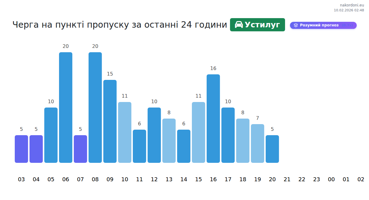 На ГКПП Устилуг се прогнозира време на изчакване за леки автомобили 31-91 минути. Избягвайте пиковите часове: 20:00, 21:00, 17:00. Най-добрите часове за преминаване са 23:00, 03:00, 05:00.