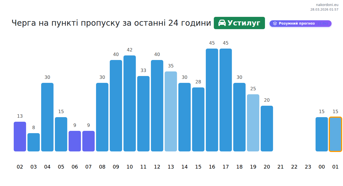 Today at Ustyluh the expected queue for passenger cars is 55–215 minutes. Peak hours: 15:00, 14:00, 17:00. Best crossing times: 22:00, 23:00, 03:00. Average wait throughout the day is around 105 minutes. Forecast accounts for daily patterns and current conditions.