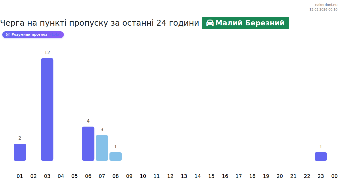 На ГКПП Малий Березний се очаква време за изчакване за леки автомобили от 15 до 165 минути. Избягвайте пиковите часове: 23:00, 22:00, 17:00. Най-кратките опашки са около 00:00, 02:00 и 05:00.