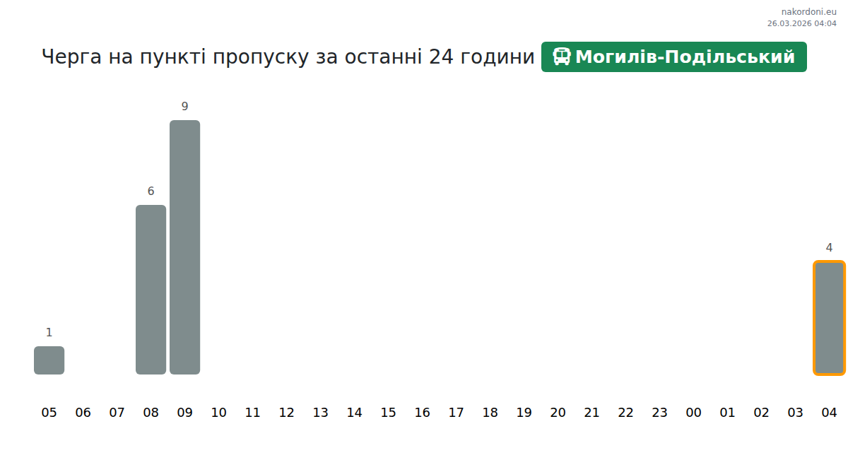 At Mohyliv-Podilskyi until end of tomorrow, expected queue is 15–6015 minutes for buses. Peak hours: 16:00, 17:00, 13:00. Shortest queues expected at 20:00, 23:00, 00:00. Tonight and tomorrow morning traffic will be moderate.