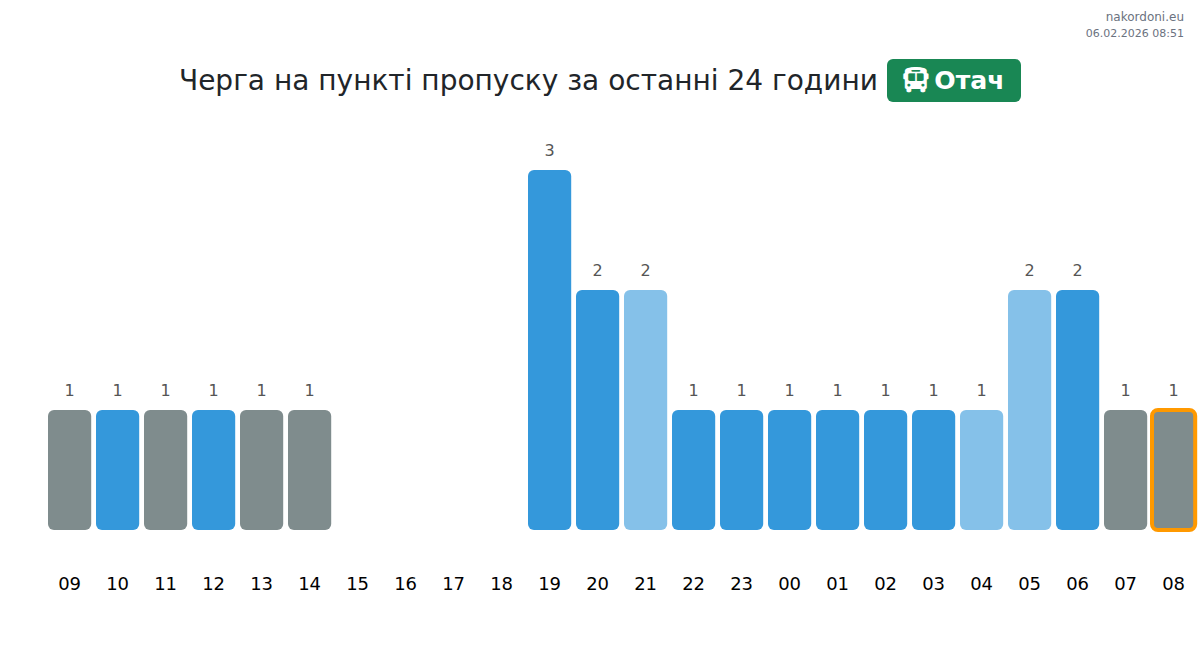 Прогнозата за Отач показва стабилно време за изчакване от 75-75 минути. За да избегнете по-дълги опашки, е препоръчително да избягвате пиковите часове от 20:00 до 22:00. За по-гладко преминаване, пътувайте между 23:00 и 01:00.