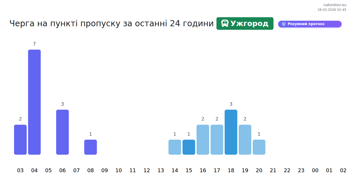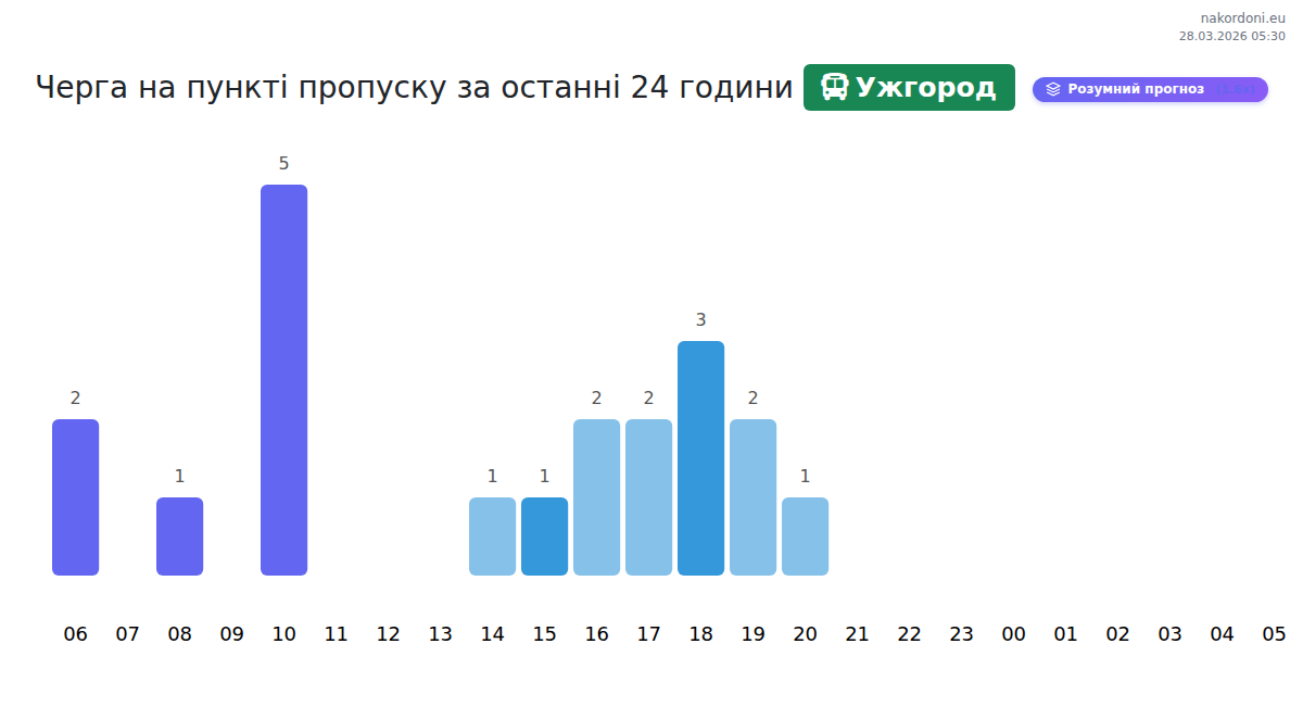 At Uzhhorod until end of tomorrow, expected queue is 15–1455 minutes for buses. Peak hours: 03:00, 14:00, 22:00. Shortest queues expected at 00:00, 05:00, 09:00. Tonight and tomorrow morning traffic will be moderate.