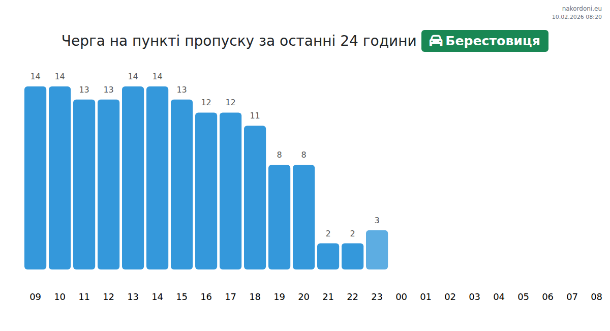 На контролно-пропускателния пункт Берестовиця очаквайте време за изчакване от 15-15 минути за леки автомобили. За да избегнете по-дълги опашки, препоръчително е да избягвате пиковите часове между 20:00, 21:00, 22:00. Най-доброто време за по-бързо преминаване е обикновено между 23:00, 00:00, 01:00.