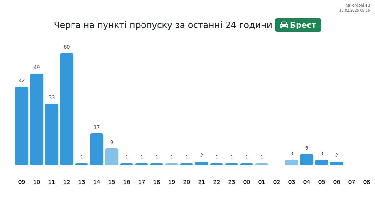 За леки автомобили на ГКПП Брест, очаквайте време за изчакване между 17-74 минути. За да сведете до минимум закъсненията, избягвайте пиковите часове около 10:00, 18:00 и 19:00. Най-кратките опашки се прогнозират за 01:00, 05:00 и 13:00.