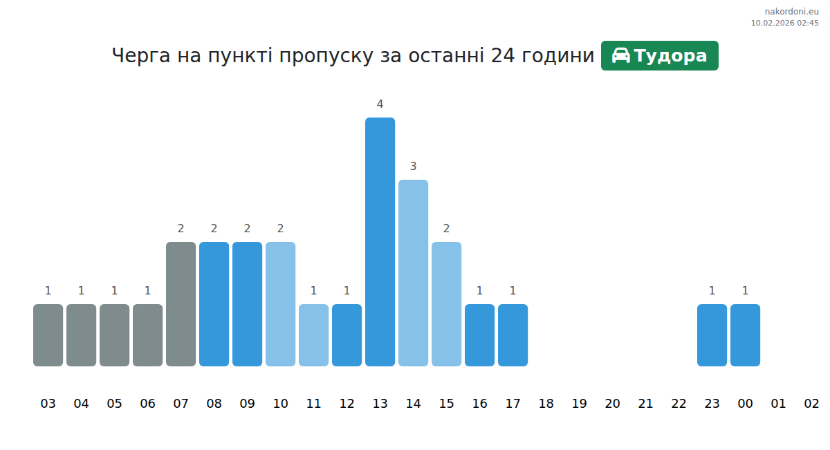На Тудора очаквайте време за изчакване за леки коли 25-55 минути. Избягвайте преминаване около 12:00, 13:00 и 14:00 поради пиковите часове. Най-добрите часове са от 23:00 до 01:00 за по-кратко чакане.