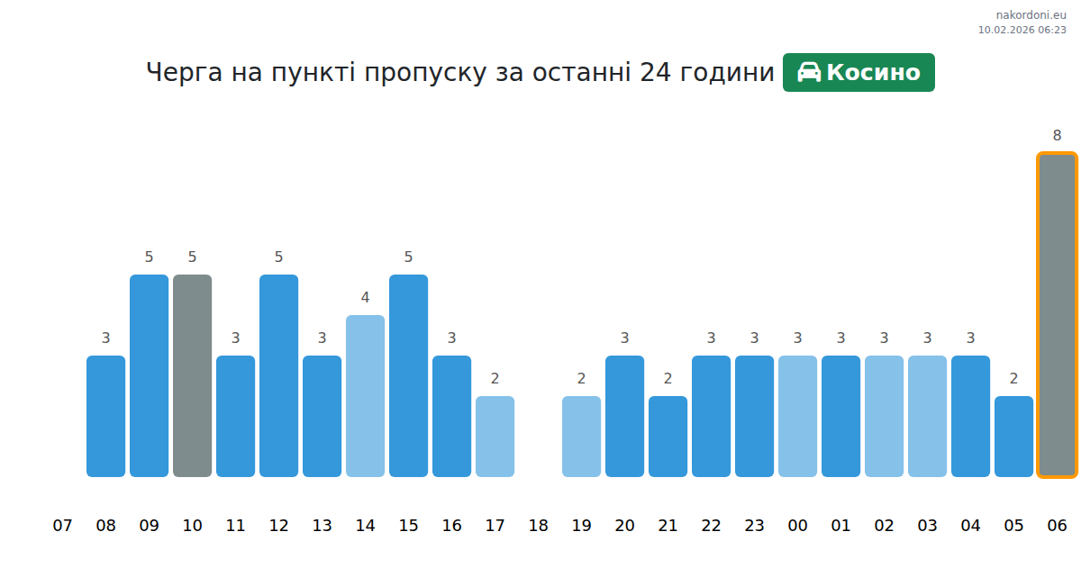 Очаквайте време за изчакване на Косино от 15 до 207 минути. Избягвайте пиковите часове в 04:00, 17:00 и 03:00. Най-доброто време за преминаване е между 00:00 и 02:00 часа за по-къси опашки.