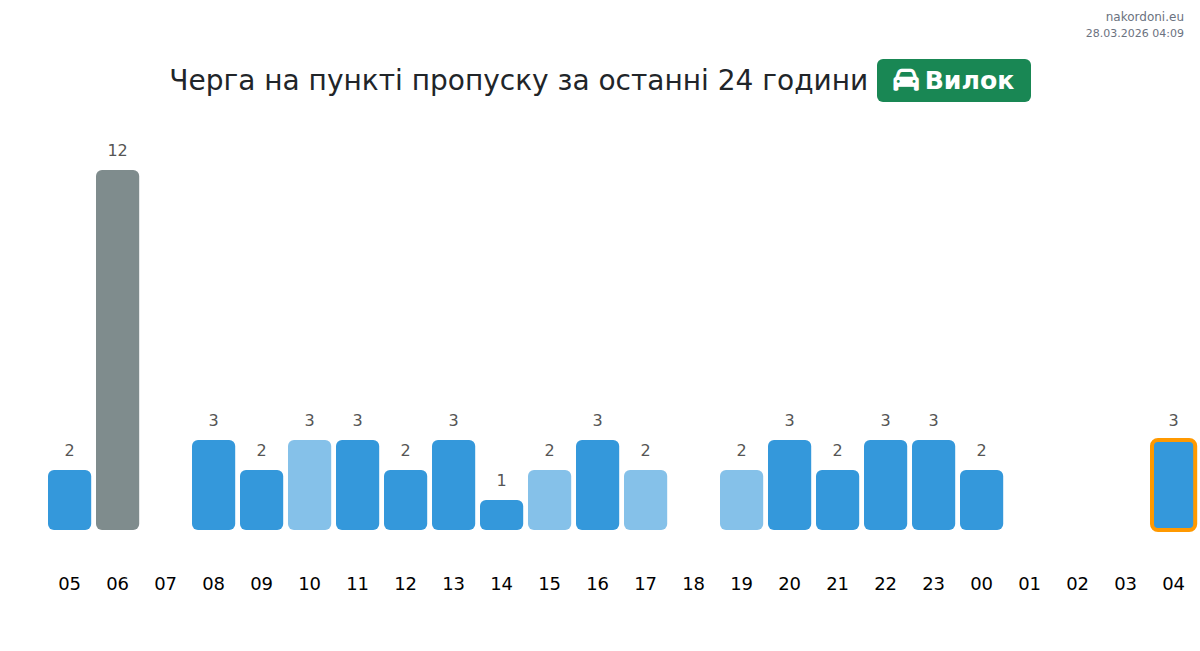 Today at Vilok the expected queue for passenger cars is 15–93 minutes. Peak hours: 20:00, 04:00, 13:00. Best crossing times: 23:00, 00:00, 01:00. Average wait throughout the day is around 31 minutes. Forecast accounts for daily patterns and current conditions.