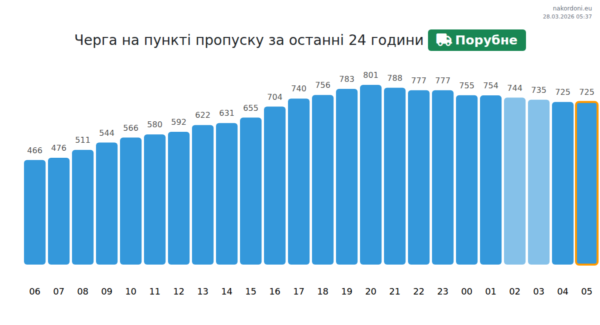 At Porubne until end of tomorrow, expected queue is 15–116175 minutes for vehicles. Peak hours: 08:00, 01:00, 00:00. Shortest queues expected at 02:00, 03:00, 23:00. Tonight and tomorrow morning traffic will be moderate.