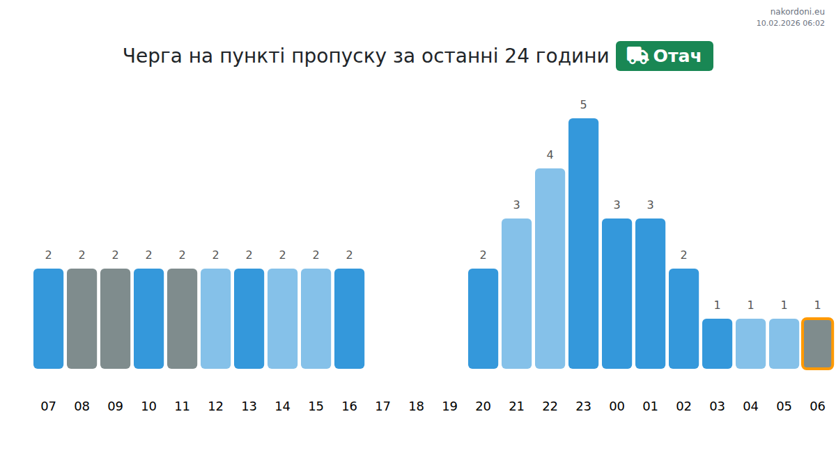 На ГКПП Отач очаквайте време за изчакване от 135-375 минути. Избягвайте пиковите часове в 13:00, 14:00 и 18:00. Най-добрите часове за преминаване са 15:00, 16:00 и 20:00.