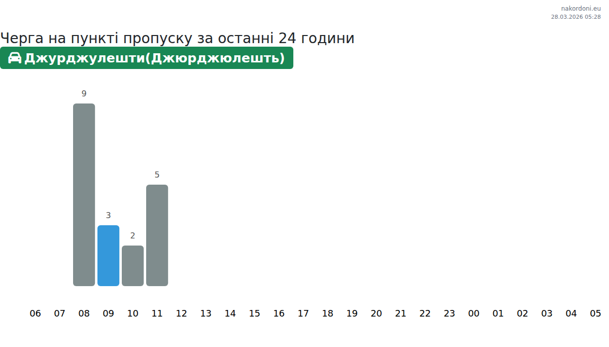 На ГКПП Джурджулешти(Джюрджюлешть) очаквайте време за изчакване за леки автомобили 15-995 мин. Избягвайте пиковите часове (06:00, 14:00, 15:00). Най-доброто време за преминаване е 16:00, 18:00, 19:00.