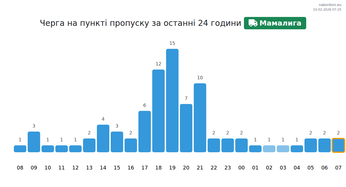 На ГКПП Мамалига времето за изчакване е 15-975 минути. Избягвайте пиковите часове (18:00-20:00) за да избегнете дълги опашки. Най-краткото чакане се очаква между 02:00 и 04:00 ч.