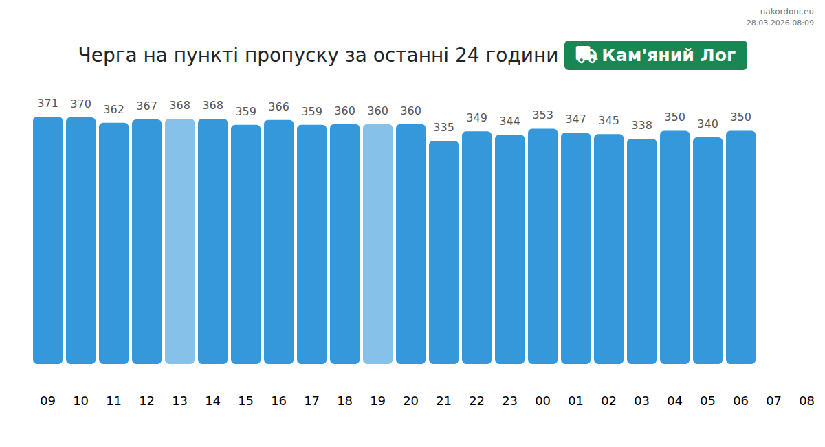 През периода опашките останаха на стабилно ниво, без значителни промени Вечерни часове (18:00 - 24:00). Най-ниската точка беше наблюдавана в 21:00 27.03.2026 — 335 камиона. Най-високата точка беше регистрирана в 18:00 27.03.2026 — 360 камиона.