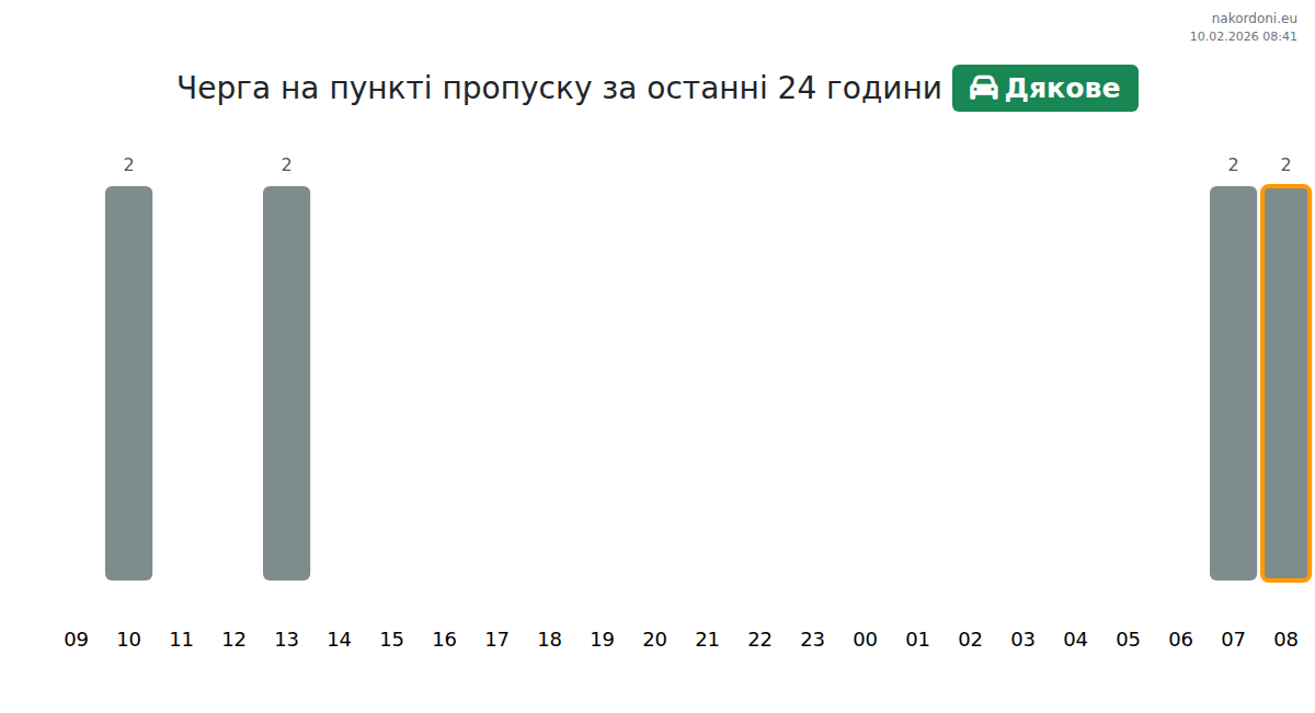 На Дякове се очакват времена на изчакване между 15-57 минути. Избягвайте пиковите часове: 11:00, 02:00, 13:00. Най-добрите часове за преминаване са 00:00, 01:00 или 03:00.