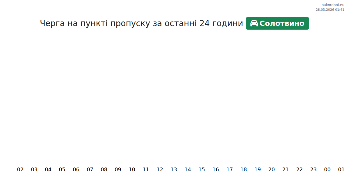 Today at Solotvyno the expected queue for passenger cars is 15–21 minutes. Peak hours: 22:00, 23:00, 13:00. Best crossing times: 00:00, 01:00, 02:00. Average wait throughout the day is around 15 minutes. Forecast accounts for daily patterns and current conditions.