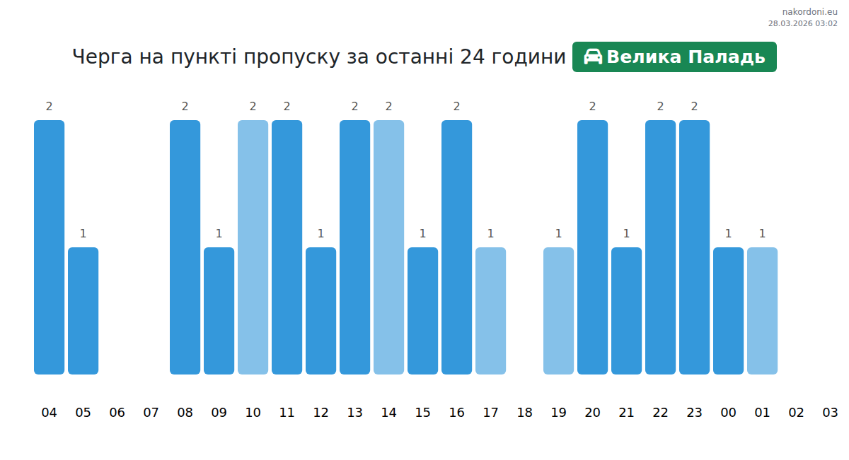 At Velyka Palad until end of tomorrow, expected queue is 15–15 minutes for passenger cars. Peak hours: 18:00, 19:00, 20:00. Shortest queues expected at 21:00, 22:00, 23:00. Tonight and tomorrow morning traffic will be moderate.