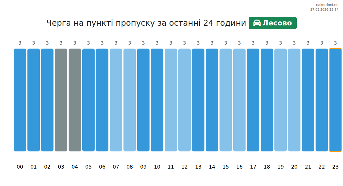 At Lesovo until tomorrow noon, expected queue is 45–45 minutes for passenger cars. Peaks: 14:00, 15:00, 16:00. Best crossing times: 17:00, 18:00, 19:00. This evening and tonight traffic is expected to decrease.