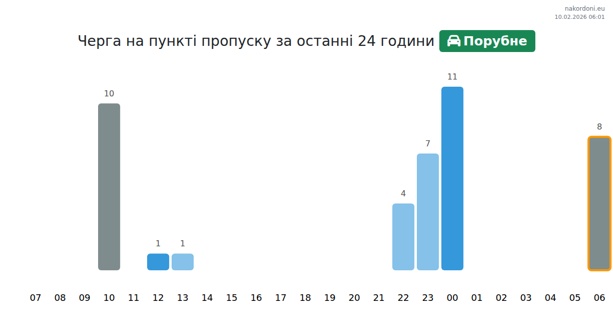 На ГКПП Порубне очаквайте време за изчакване между 15-315 минути. Избягвайте пиковите часове: 04:00, 17:00, 03:00. Най-кратки опашки се прогнозират около 22:00, 00:00 и 05:00.