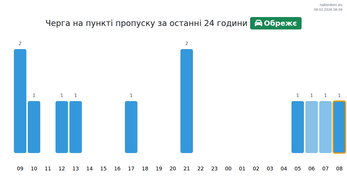 Броят на превозните средства през Вечерни часове (18:00 - 24:00). Най-ниската точка беше наблюдавана в 21:00 09.02.2026 — 1 автомобил. Най-високата точка беше регистрирана в 21:00 09.02.2026 — 1 автомобил.