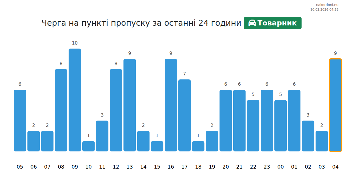 На пункт Товарник очакваното време за изчакване за леки автомобили е между 113 и 143 минути. Избягвайте преминаване между 11:00, 12:00 и 14:00 часа поради пиково натоварване. За по-кратки опашки, помислете за преминаване около 01:00, 03:00 или 04:00 часа.