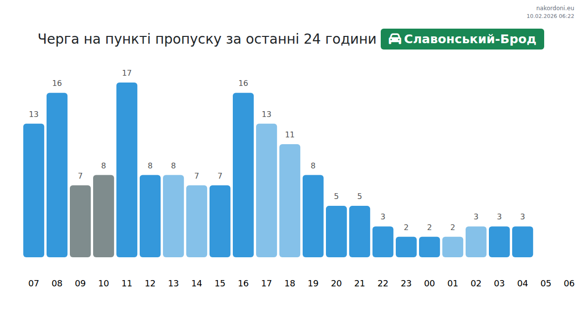 На ГКПП Славонський-Брод се очаква време за изчакване за леки автомобили от 89-137 минути. Избягвайте пиковите часове: 09:00, 11:00, 10:00. Най-доброто време за преминаване е 01:00, 02:00, 03:00.