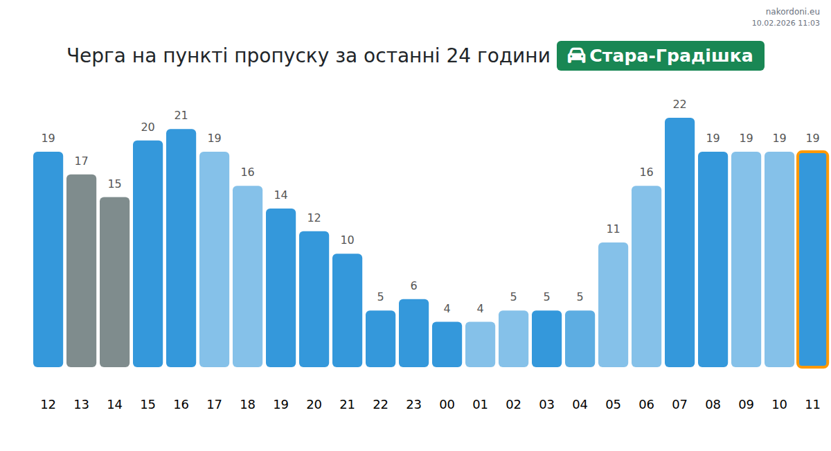 На Стара-Градишка очаквайте време за изчакване за леки автомобили от 101 до 197 минути. Избягвайте пиковите часове: 09:00, 10:00, 11:00. Най-кратки опашки се прогнозират между 02:00 и 04:00.