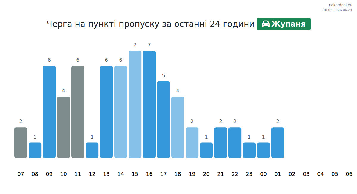 На ГКПП Жупаня се очаква време за изчакване от 71-107 минути. Избягвайте пиковите часове: 12:00, 10:00 и 11:00. Най-добрите часове за преминаване са 01:00, 02:00 и 03:00.