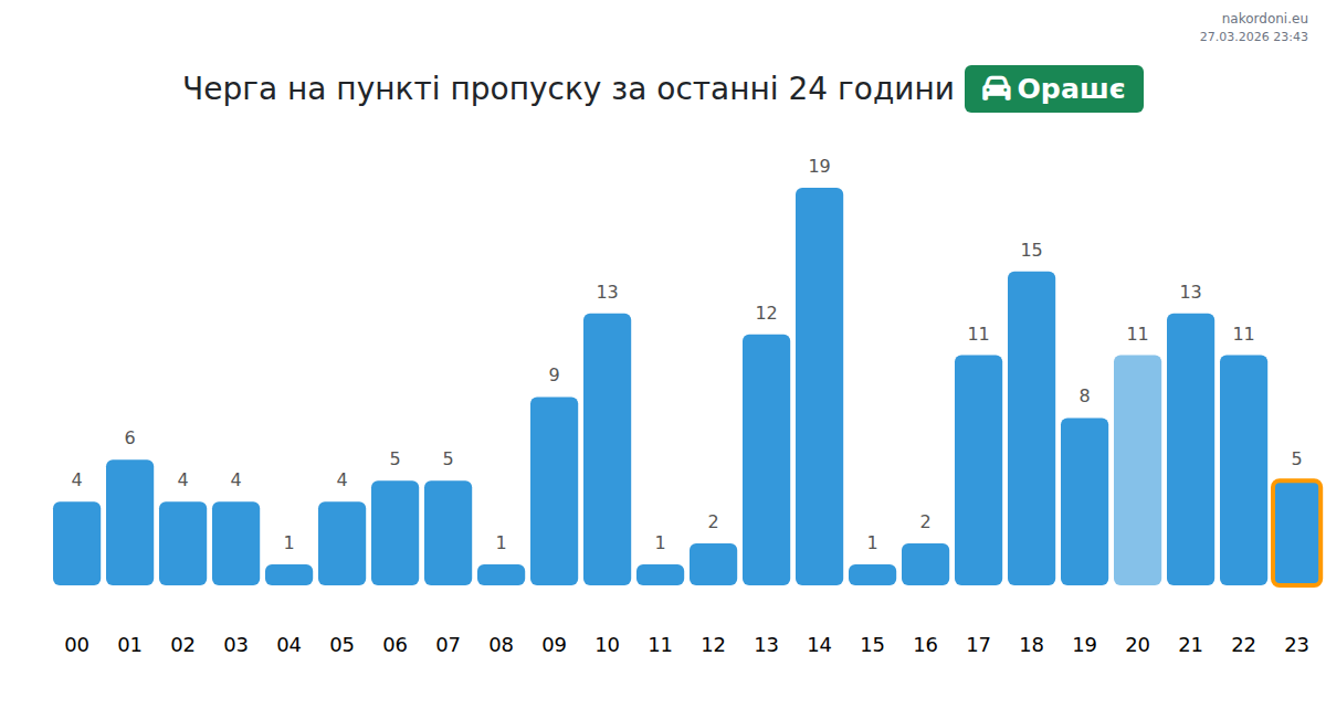 At Orašje until tomorrow noon, expected queue is 95–167 minutes for passenger cars. Peaks: 16:00, 12:00, 09:00. Best crossing times: 22:00, 23:00, 19:00. This evening and tonight traffic is expected to decrease.