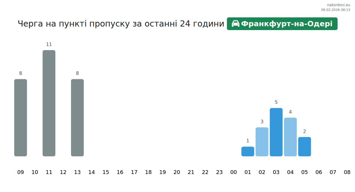На Франкфурт-на-Одери се очаква време за изчакване 15-81 минути. За да избегнете дълги опашки, избягвайте 18:00, 10:00 и 16:00 часа. Най-доброто време за преминаване е 01:00, 03:00 и 05:00 часа.