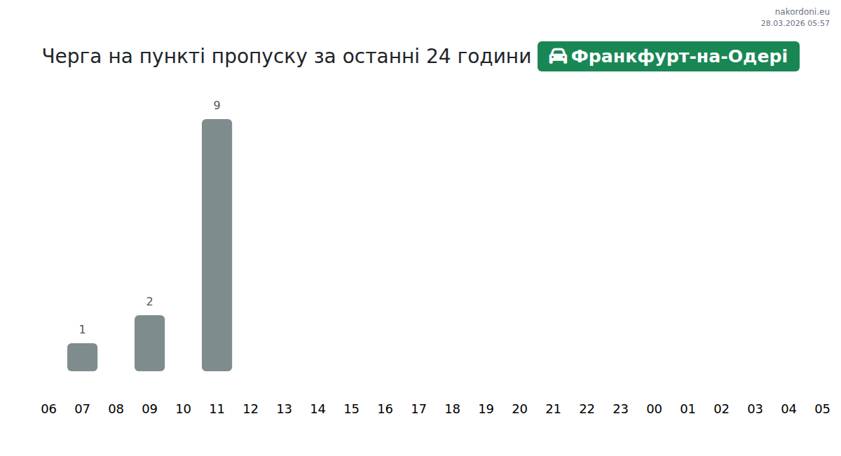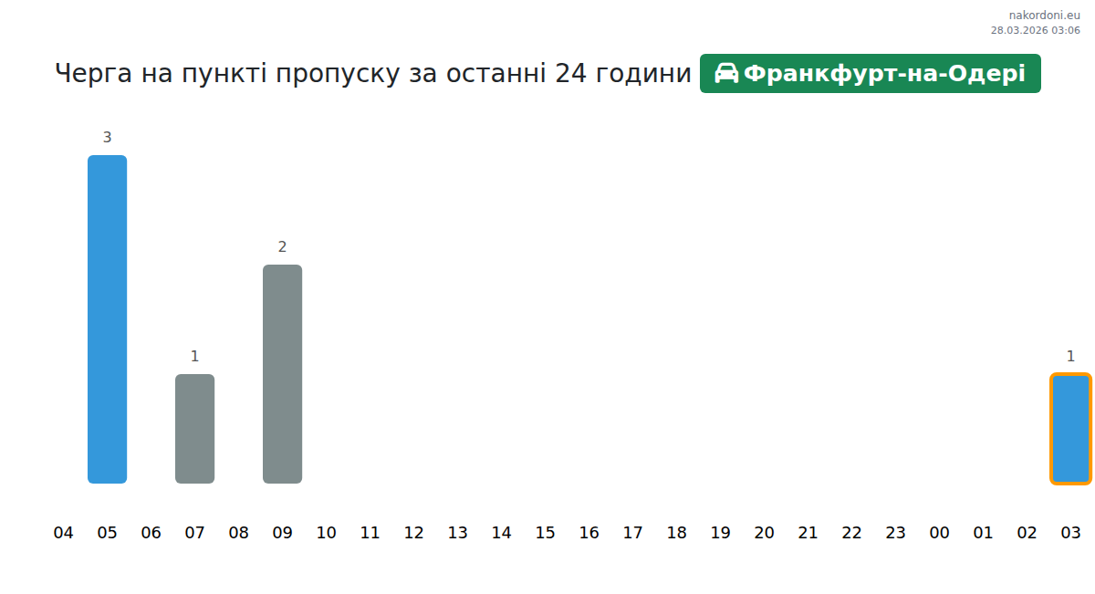 Today at Frankfurt Oder the expected queue for passenger cars is 15–69 minutes. Peak hours: 10:00, 12:00, 14:00. Best crossing times: 01:00, 03:00, 05:00. Average wait throughout the day is around 30 minutes. Forecast accounts for daily patterns and current conditions.