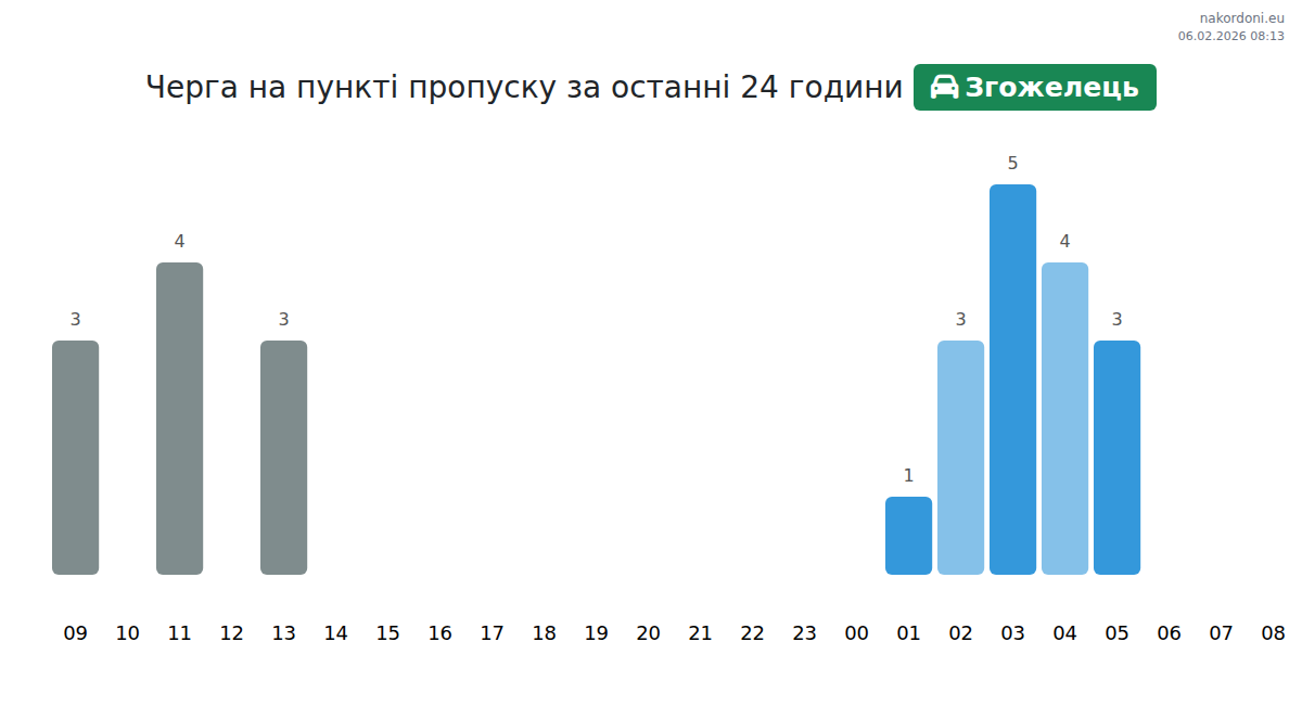 На ГКПП Згожелець очаквайте време за изчакване между 15-39 минути. Избягвайте пиковите часове (00:00, 16:00, 18:00) за по-бързо преминаване. Най-доброто време е 01:00, 03:00 и 05:00.
